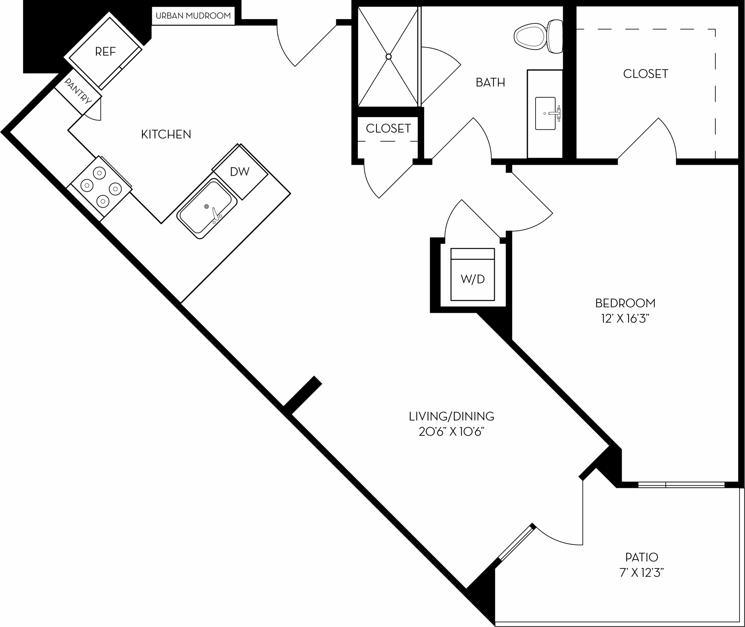 Rendering of the SF floor plan with a Studio bedroom and 1 bathroom[s] at The Wyatt