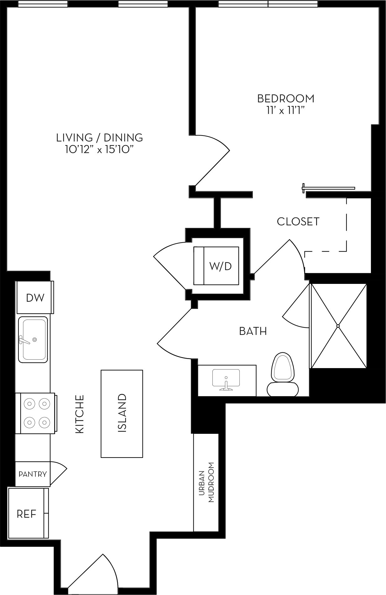 Rendering of the 1D floor plan with 1 bedroom[s] and 1 bathroom[s] at The Wyatt
